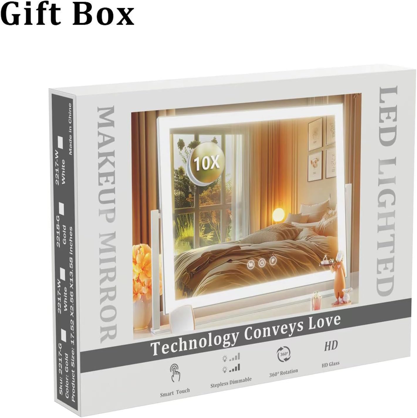 Lighted Makeup Mirror, 17.3″x13″ Hollywood Vanity Mirror with Led Lights, Three Color Lighting Modes, and 5X Magnification Mirror, Smart Touch Control, 360°Rotation (White, Gift Box)